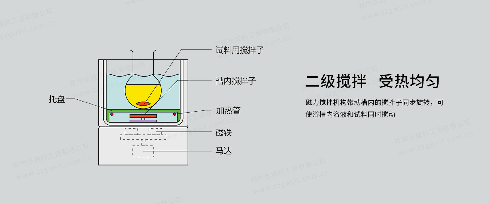 ●磁力搅拌机构带动槽内的搅拌装置同步旋转,搅动浴液,使浴液受热均匀;